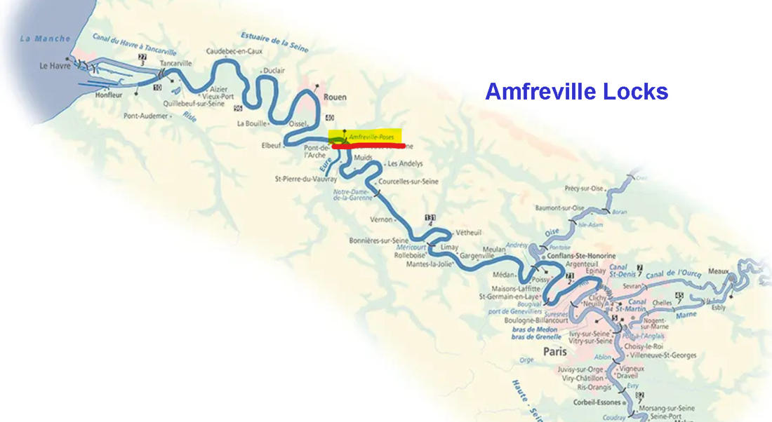 Amfreville Locks The Amfreville locks, located in Amfreville-sous-les-Monts, France, are the last set of locks on the Seine, in the direction of the English Channel, and the first locks encountered when navigating upstream. It marks the beginning of the inland waterway section of the Seine. |
