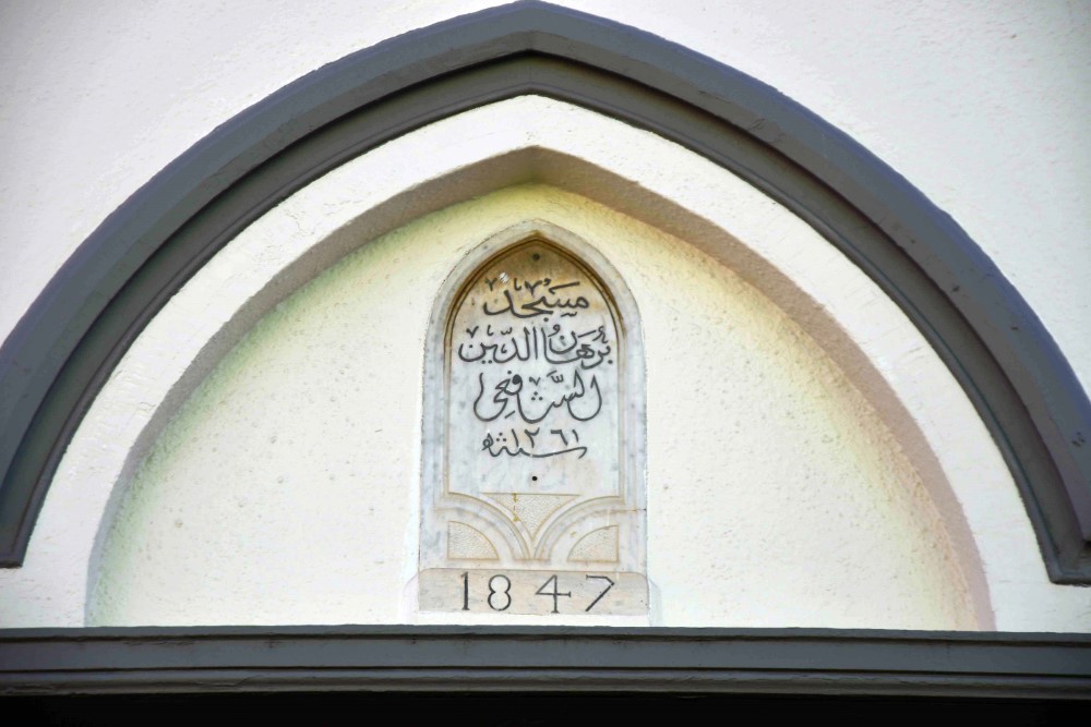 The Arabic reads: Burhan al-Din al-Shafa'i Mosque, AH 1261 (Muslim year equating to 1845, not 1847)